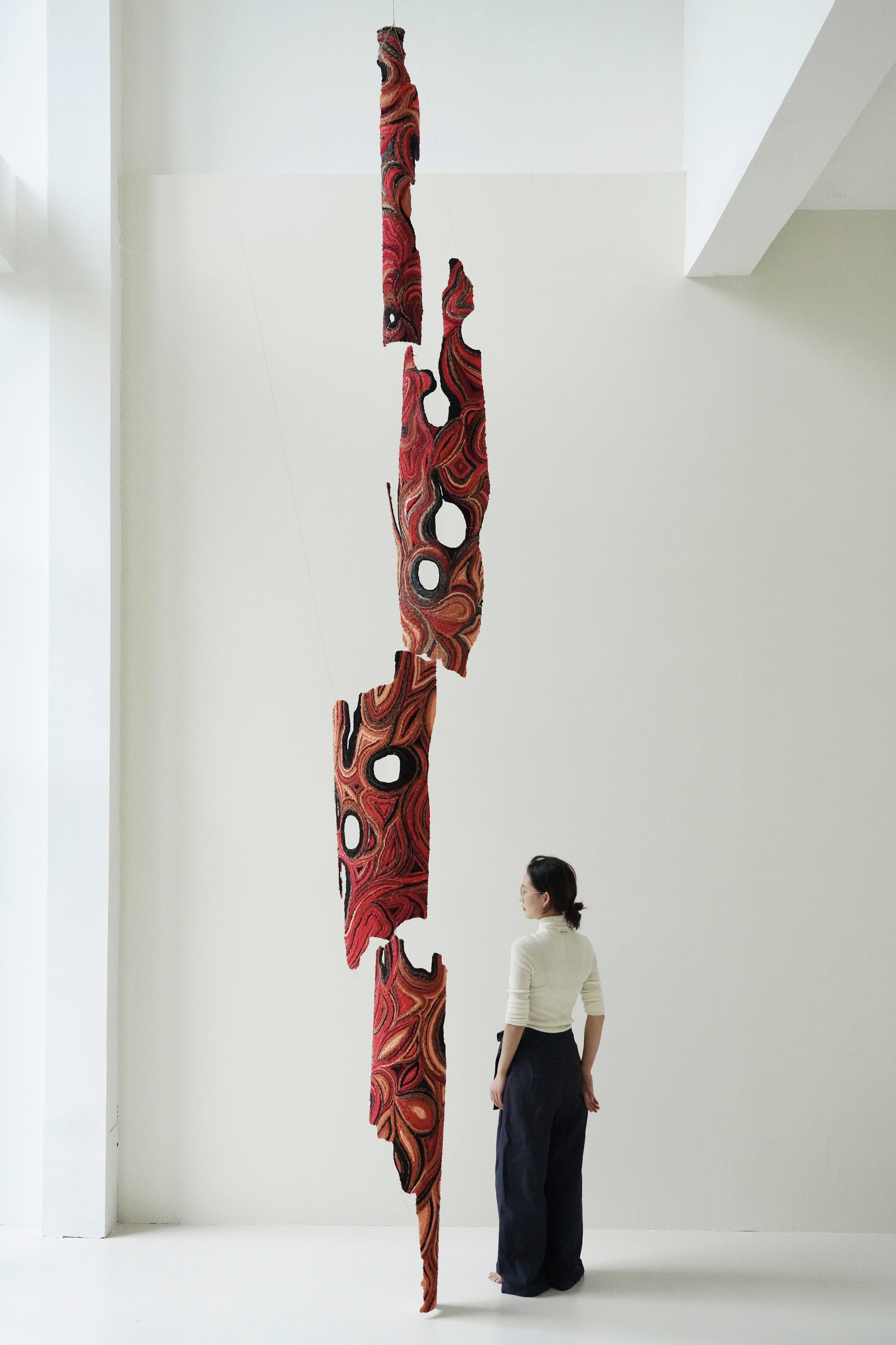 Through Shidong embroidery and reclaimed fabrics, the artist translates Miao heritage into abstract spatial forms. Her work explores collective memory and the rhythm of the land.